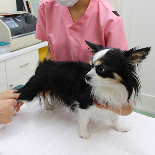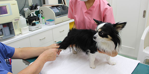 | 身体検査 | 測定項目 体重・体温・心拍数・呼吸数 聴診(心臓、肺の音及び腹部内の音を聴き、異常の有無を調べます。) 視診(眼、耳、歯及皮膚などを見て、異常の有無を調べます。) 触診(関節、骨及び体表、腹部内などを触り、異常の有無を調べます。) |
